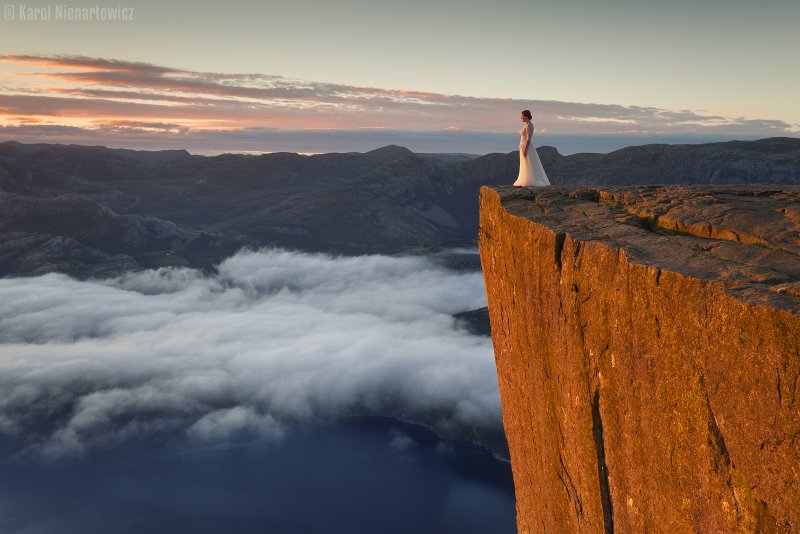 Niezwykłe norweskie krajobrazy przyciągają nie tylko przygotowanych trekkingowo turystów z całego świata ale także … nowożeńców. Norwegia i Islandia to obecnie dwa najpopularniejsze kraje, w których organizuje się sesje ślubne w terenie. Zatem nie zdziwmy się, gdy na szlaku na Preikestolen spotkamy pannę młodą i pana młodego. Moda na tego typu eskapady doprowadziła już do powstania odrębnego segmentu w branży – turystyki ślubnej.