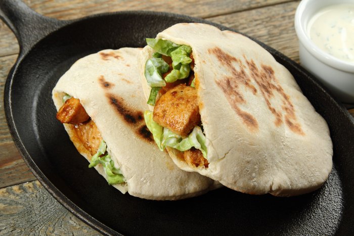 Chlebki pita opiecz z obu stron na suchej rozgrzanej patelni. Gdy „napęcznieją” zdejmij je i rozetnij każdy z nich tak, aby powstały kieszonki.