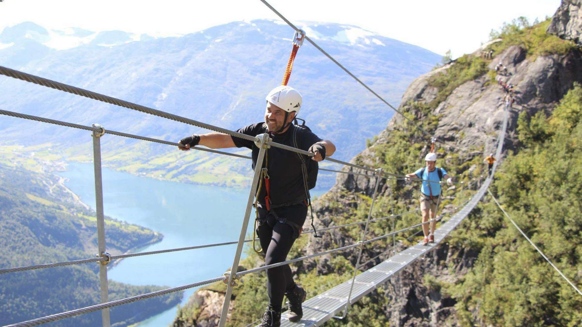 Po pokonaniu widokowej trasy zboczem góry, z której roztaczają się widoki na fiord i lodowiec na wysokości 750 m dochodzimy do otwartego w 2013 roku najdłuższego przy via ferracie mostu wiszącego w Europie. Widok z niego – jeśli ktoś zdoła się tam zatrzymać – jest imponujący - wody Hundvikfjord i turkusowe jezioro Lovatnet i skalne zbocza dookoła.